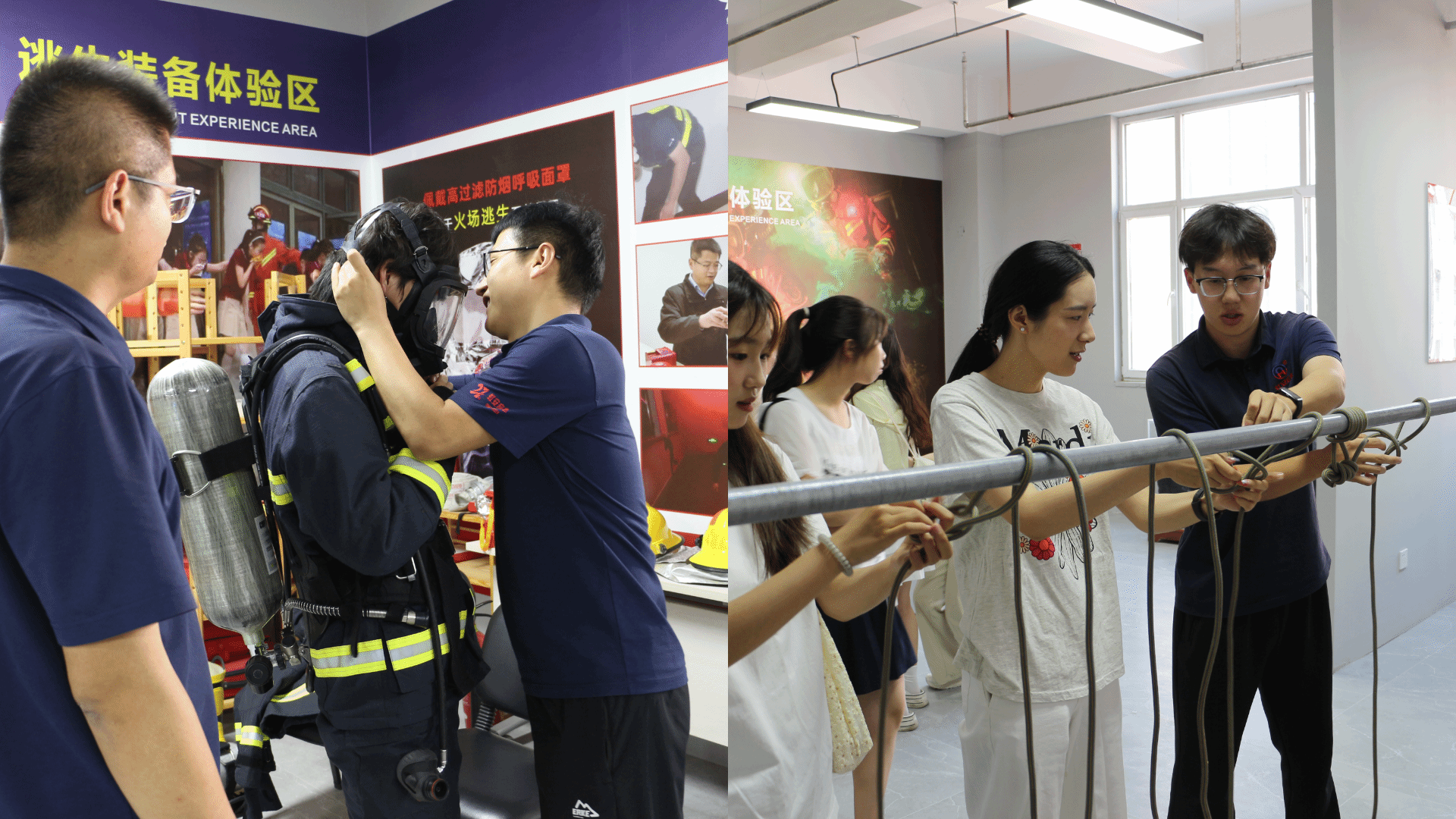 此外,公司精心安排了丰富的应急救援体验活动。教练们带领大家实际穿戴应急救援产品、进行结绳训练、学习院前急救知识、感受VR灭火逃生、体验消防帐篷逃生及缓降器、灭火毯实操等环节,通过实际体验,参访师生对“人人学急救,人人懂救急”有了深刻的体会。