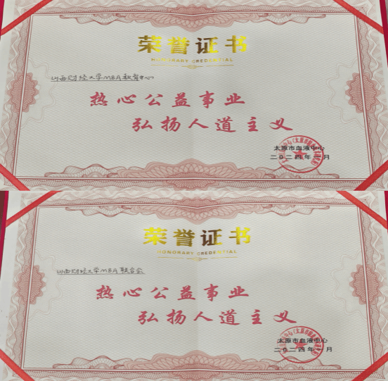 MBA联合会颁发了“热心公益事业,弘扬人道主义”荣誉证书。