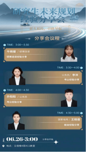 研究生未来规划经验分享会为同学们提供了一个全方位、多层次、立体化的指导交流平台,帮助同学们在学术追求与职业规划之间找到最佳平衡,实现自我价值与社会需求的完美对接,助力同学们顺利升学、高质量就业保驾护航。(牛群 杜昕汝 供稿)
