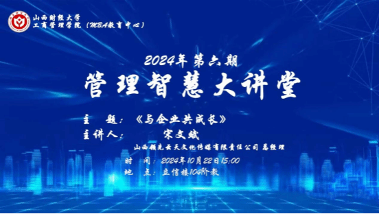 在立信楼104阶梯教室举办2024年第六期“管理智慧大讲堂”。本次活动邀请了优秀校友、太原市迎泽区第六届人大代表、山西领先云天文化传媒有限责任公司总经理宋文斌先生作了题为“与企业共成长”的专题讲座。讲座由皇冠体育