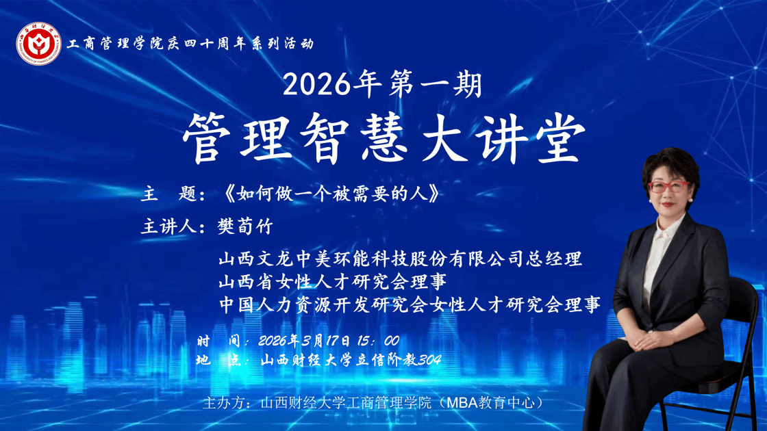 “管理智慧大讲堂”2026年第一期在立信楼阶梯教室304成功举办。山西文龙中美环能科技股份有限公司总经理樊荀竹女士应邀作题为《如何做一个被需要的人》的专题讲座。皇冠体育