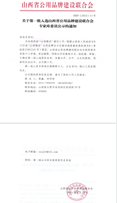 近日,山西省公用品牌建设联合会公示了第一批入选专家库委员名单,皇冠体育