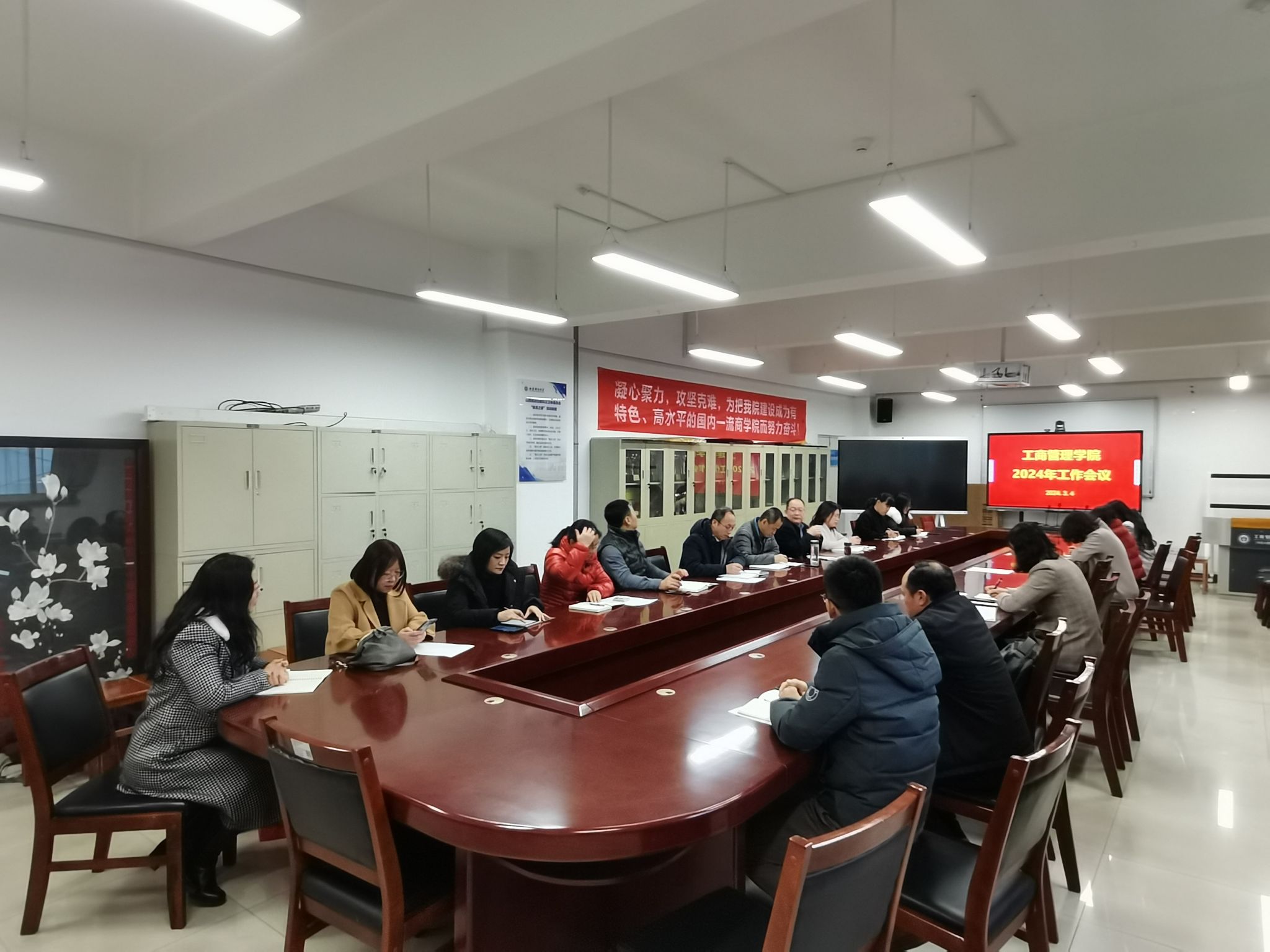 在会议室召开2024年工作会议,传达皇冠体育