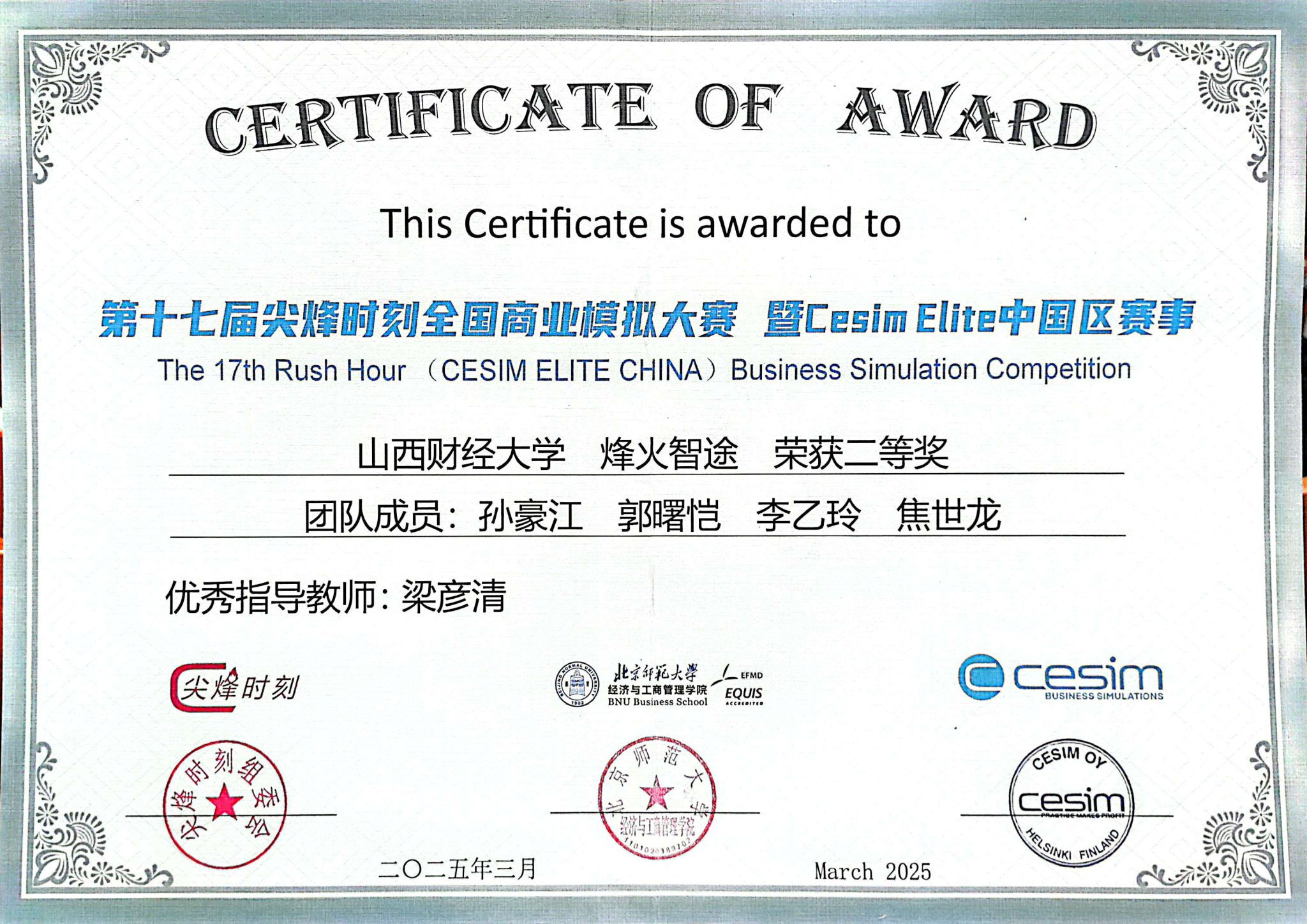 经过近半年的艰苦奋斗,我们终于如愿以偿地斩获本科组全国二等奖,并获得尖烽海报奖。这份荣誉是对我们团队努力与付出的最好见证,也是对我们团结协作精神的充分认可。回首这段竞赛历程,小组视频的拍摄、团队海报的制作、商业演示、英文团队介绍的精彩呈现以及商业模拟中每一轮决策的深入讨论,都成为了我们团队最宝贵的财富,不仅锻炼了我们的专业能力,也提升了我们的综合素质。