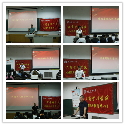 领导、校友代表分别为新生寄语。周志刚副书记勉励新生应脚踏实地,提高专业知识与人文素养,尽快适应新的环境,做到立大志、明大德、成大才、担大任。薛继东副院长从家长和老师两个角色出发,指出学生要规律生活,在群体中接纳他人,换位思考,培养服务意识与管理才干,以实践为主。齐永智副院长希望新生可以合理管理时间,做一个有目标的人,发现身边人的优点,同时善于运用营销学来提高自己。闫春副院长同新生一起共勉,面对新的挑战,要肩负使命,跟上时代的步伐,做到青春无悔,不负韶华,坚持不懈,披荆斩棘。团委书记任少华老师引用“大学之大,非有大楼之谓也,乃有大师之谓也”,勉励新生克服外界环境因素,既来之则安之。MBA校友会会长王建勤希望新生能志存高远,持之以恒,学好知识,牢记“修德立信、博学求真”的校训,共同走向更广阔的天地。