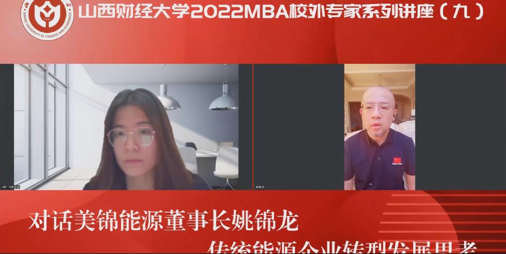 2022MBA校外专家系列讲座第九期在“腾讯会议”平台圆满举办。山西美锦能源股份有限公司董事长姚锦龙先生带来了题为《传统能源企业转型发展思考》的专题讲座,本次讲座首次采用对话的形式开展,互动元素大幅提升,2020级、2021级MBA学员、2022级拟入学MBA学员、部分MBA教师、MBA校友及社会人士等共440余人参加,在线人数再破记录,本期讲座还得到MBAChina网站的同步转播,当晚转播页面浏览量达2600余人次。