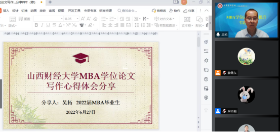 MBA学位论文培养情况、全国MBA教指委《MBA学位论文标准与规范》、“不合格”学位论文的评审意见、MBA学位论文开题报告要点五个部分进行了讲解和分析。通过聆听此次报告,老师和学生们对MBA学位论文的标准、流程、要求、常见问题及解决方案等方面有了更加深入地了解。而后,MBA学员代表吴拓进行了学位论文写作心得体会分享,与会人员进行了问题交流。