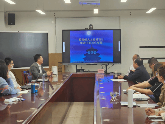 孙国强教授首先介绍了教育部人文社科项目写作模板,对申报书A表与B表的主要内容进行了简单说明。接下来,孙国强教授按照申报书B表的写作模板,就选题、理论与应用价值、国内外研究现状与趋势、研究目标和内容的重点难点、研究思路与进度、研究方法、研究基础及资料准备、中期、最终成果及去向、经费预算共十个部分进行了讲解,对每个环节的要求和标准、写作方法、写作技巧、注意事项等进行了详细的解读。随后,孙国强教授结合历年不同学科的立项率讲解了申报课题的学科选择。最后,孙国强教授从申报人条件、团队成员、申报书页面设计等角度提出了课题申报的一些注意事项。
