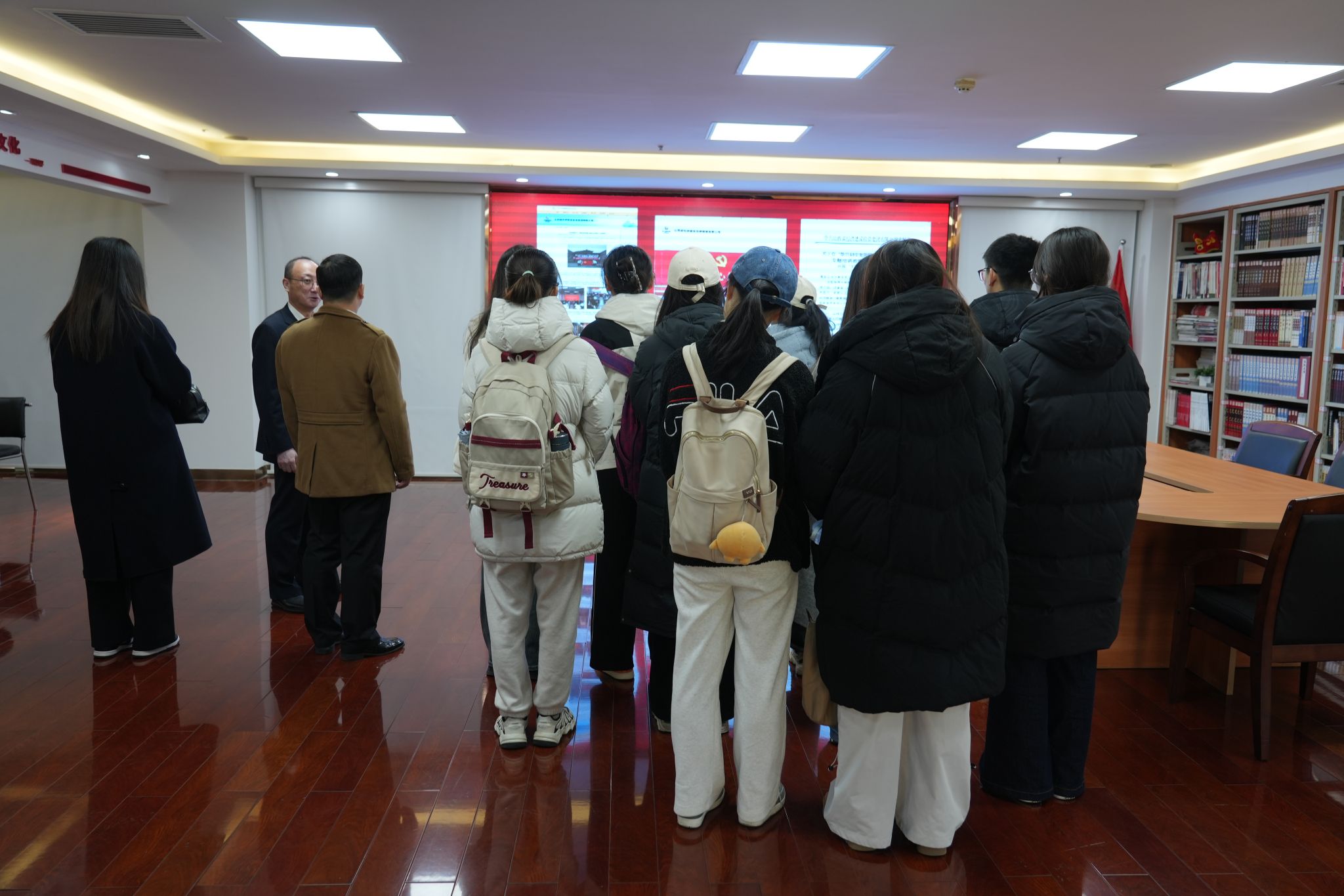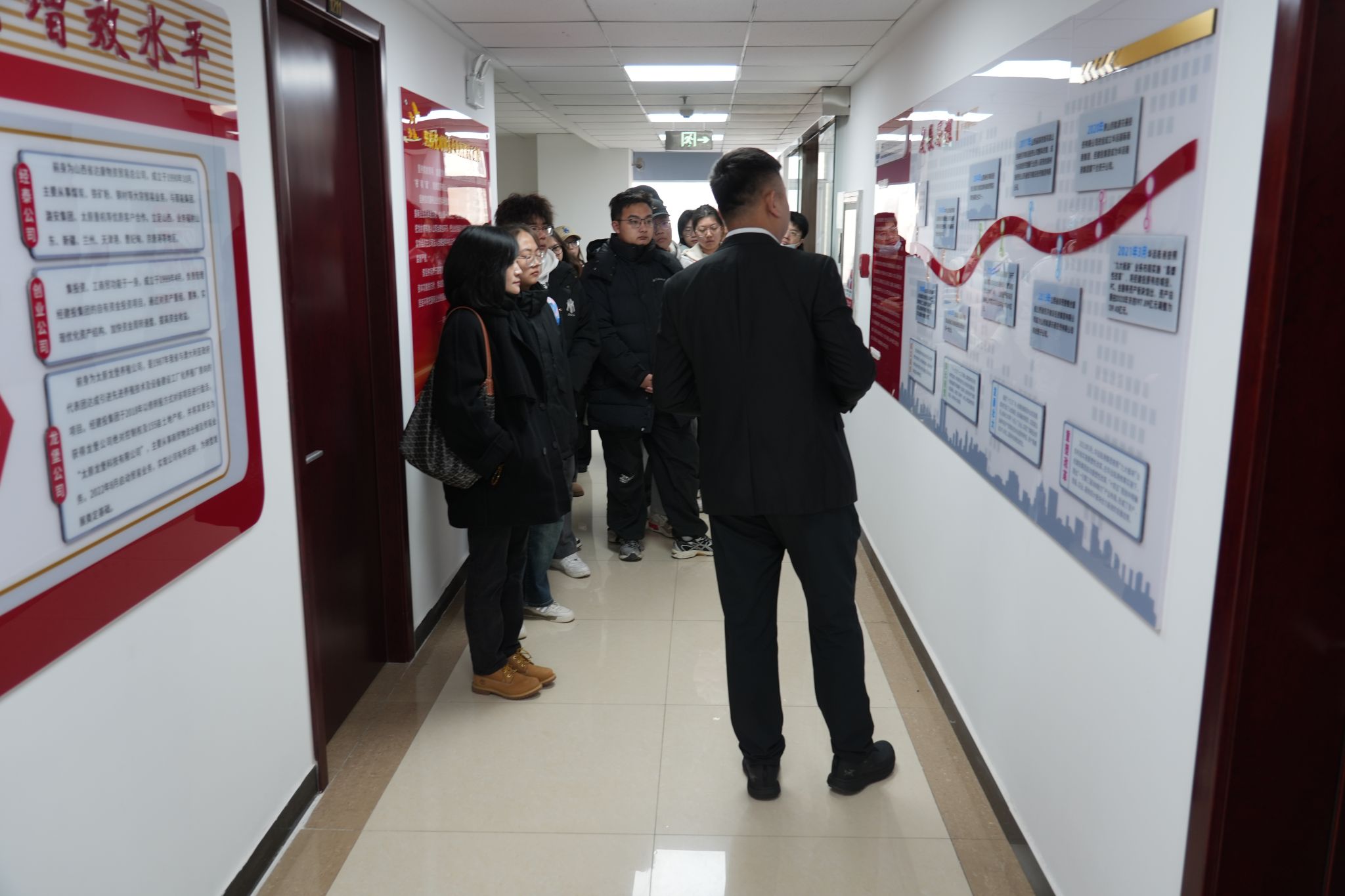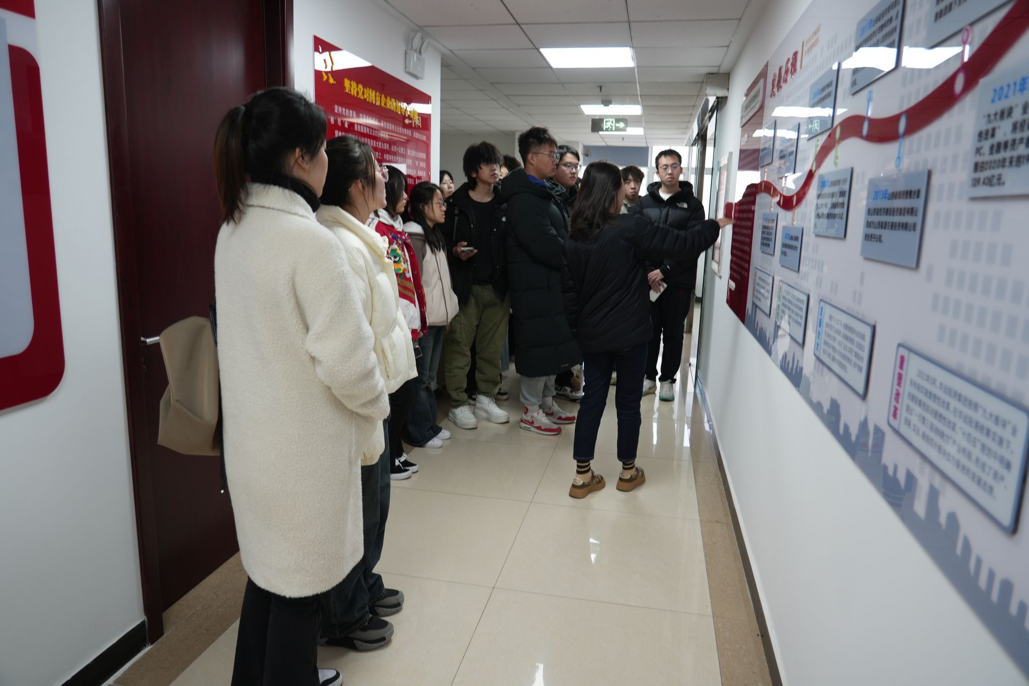 师生分三批对集团各部门、文化墙、产品样品陈列进行了参观、介绍,并观看了企业宣传片。同学们对于经建投集团的发展历程、四大业务板块、业务的发展与转型、党建工作、工会荣誉以及皇冠体育