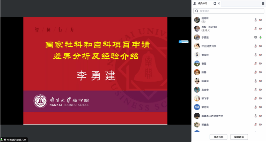 李勇建教授以“国社科特点与注意事项—国自科特点与注意事项—两类项目选择策略”为清晰脉络,展开系统深入的分享。在国家社科基金项目板块,他重点聚焦国家政策与选题方向、项目类别与研究导向,详谈关于国家课题选题与框架设计的几点思考,强调经济与管理学科项目申报理应具有现实性、针对性和较高的决策参考价值。此外,他结合通讯评审的核心指标,拆解了课题论证活页的撰写要点:选题需紧扣国家政策文件、自身研究基础与学科前沿,论证要突出选题依据的现实意义、研究内容的逻辑层次、创新之处的鲜明特色,同时重点阐述代表性研究成果,明确课题的理论与方法创新。