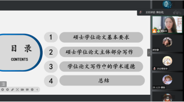 郭金花老师主要围绕硕士学位论文基本要求、主体部分写作要领和写作中的学术道德三个方面进行了报告。首先,从学位论文的选题要求和学位论文写作的重要时间节点安排两个方面,讲述了当前2020级硕士生学位论文写作的重要性和紧迫性,郭老师指出毕业论文选题必须是新颖的问题、有价值的问题、可研究的问题和专业性的问题。其次,从毕业论文结构安排、主体部分写作要领等方面分享了硕士学位论文撰写规范。最后,郭老师特别强调了学位论文写作过程中的学术道德问题,指出坚决杜绝“伪造或篡改数据、抄袭与剽窃他人观点、杜绝英文文献二次引用等”。论坛之后多名同学表示,讲座对自己正在进行的硕士学位论文撰写有较大的启发。(陈鑫 供稿)