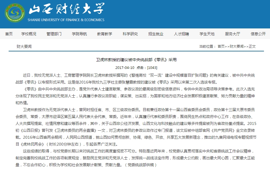 院长卫虎林教授所撰写的《警惕高校“双一流”建设中规模盲目扩张问题》的有关建议,被中共中央统战部《零讯》以专报形式采用。这是继2016年皇冠体育