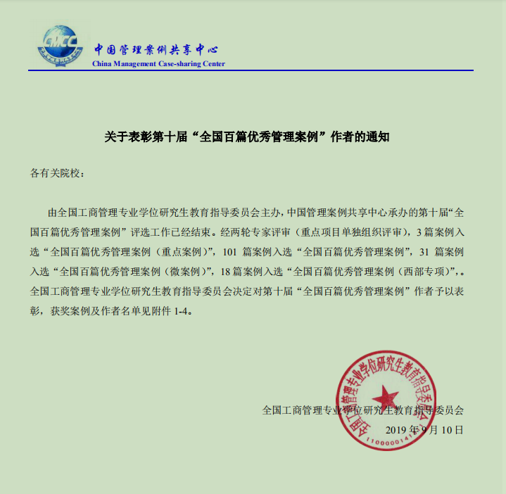 9月10日,由全国工商管理专业学位研究生教育指导委员会主办、中国管理案例共享中心承办的第十届“全国百篇优秀管理案例”评选结果公布。皇冠体育