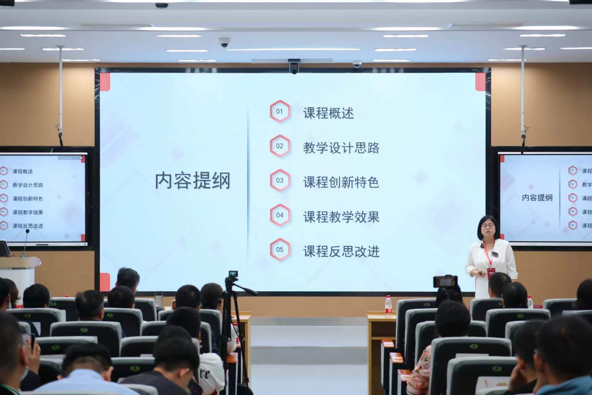 “管理学”课程思政的教学目标、设计思路、教学模式、资源建设、创新特色和育人成效等况等,决赛现场,有近百名教师观摩。