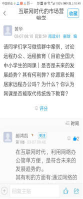 3、讨论学习应用知识点。结合目前疫情提供了关于远程办公、网络教育等问题的案例材料,让学生结合营销环境的变化和自己的实际情况提出看法,因为讨论题对于学生来说都是参与者和关注者,同时大家也和我一样也为此矛盾和困惑,55名同学,59份回复,大家讨论积极热烈。我也进行了评价和追问,引发学生深入思考营销理论在实践中的运用。