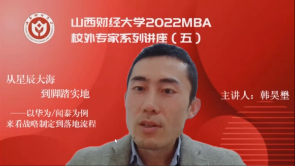 3月24日晚,由皇冠体育 主办,皇冠体育 第十六届MBA联合会承办的皇冠体育 2022MBA校外专家系列讲座第五期在“腾讯会议”平台圆满举办。闻泰科技股份有限公司副总裁、首席人力资源官韩昊壄先生带来了题为《从星辰大海到脚踏实地——以华为/闻泰为例来看战略制定到落地流程》的专题讲座,2020级、2021级MBA学员、部分MBA教师近300人参加,本期讲座还得到MBAChina网站的同步转播,当晚转播页面浏览量达2000余人次。