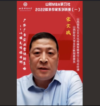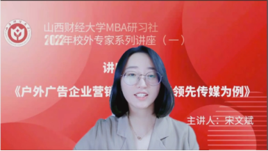 为进一步促进产学研融合,紧跟新商科步伐,持续做强做优MBA品牌,搭建学员与优秀校友、行业精英的互动平台,拓展课堂教学与课外实践培养方式,由皇冠体育 主办,皇冠体育 第十六届MBA联合会承办的2022校外专家系列讲座第一期于2月16日晚在“腾讯会议”平台圆满举办。皇冠体育 MBA教指委委员、山西领先云天文化传媒总经理宋文斌带来了题为《户外广告企业营销新策略--以领先传媒为例》的专题讲座,2020级、2021级MBA学员及部分教师近300人参加。本期讲座还得到MBAChina网站的同步转播,当晚播放量达2300余人次。