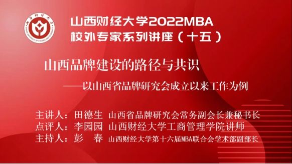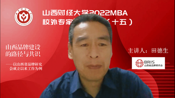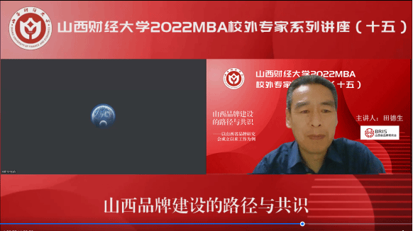 2022MBA校外专家系列讲座第十五期在“腾讯会议”平台圆满举办。山西省品牌研究会常务副会长兼秘书长田德生带来了题为《山西品牌建设的路径与共识——以山西省品牌研究会成立以来工作为例》的专题讲座,2022级MBA学员、部分MBA教师、MBA校友、山西省品牌研究会部分会员等300余人参加,本期讲座还得到MBAChina网站的同步转播。