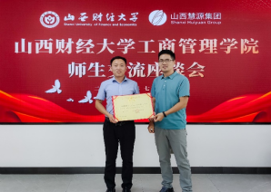 为山西慧源人力集团颁发“实践教学基地”牌匾,并为工会主席、副总经理冯伟、副总经理康志龙颁发校外实践导师聘书。(薛靖涛 供稿)